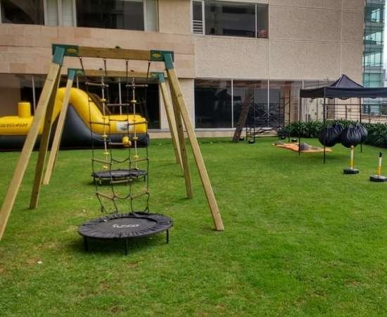 • 1 estructura metálica con telaraña y pared de escalar, prueba pecho tierra, prueba de bolas que esquivar, pruebasen alberca de 4×4 m
